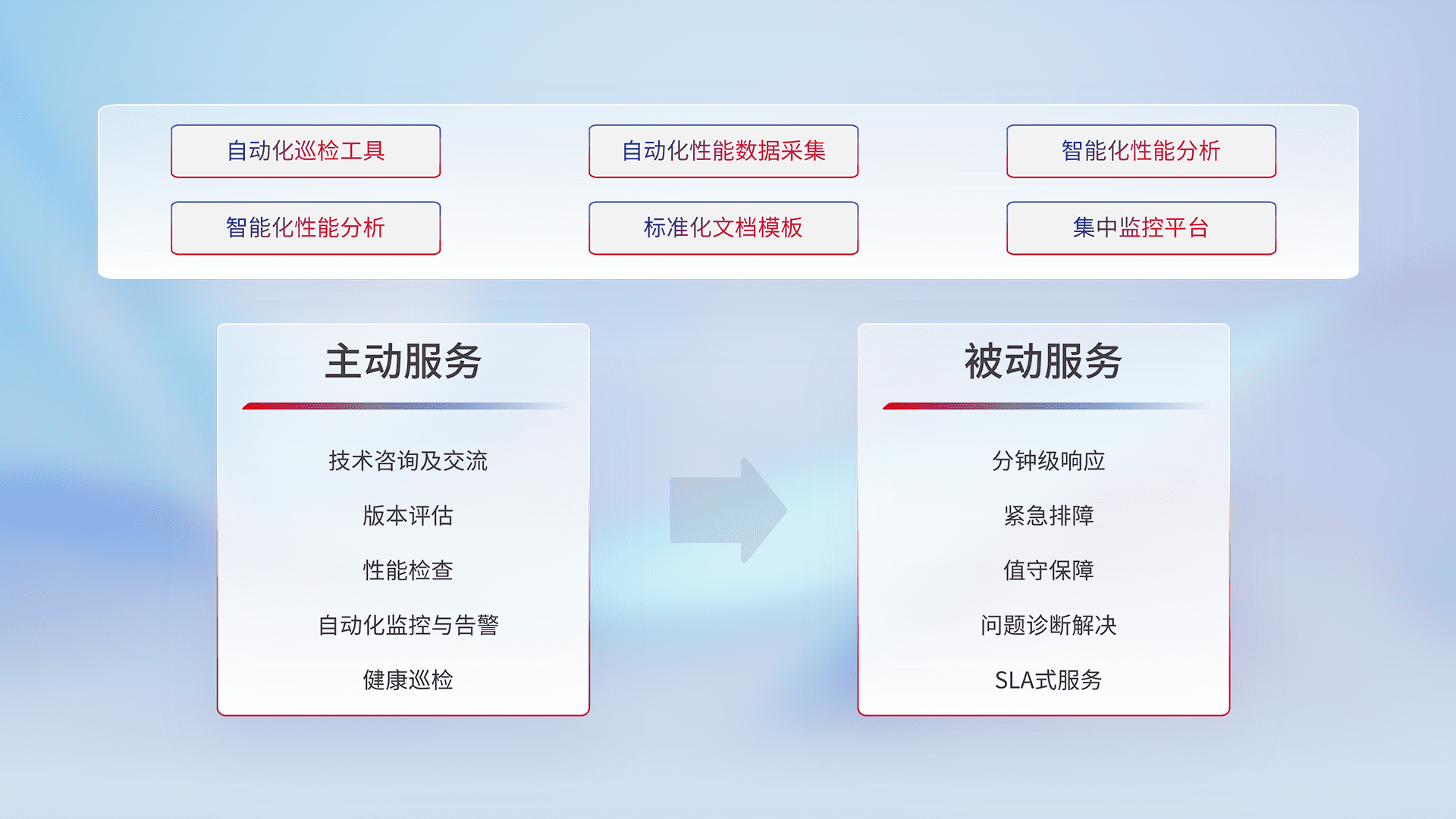 智能化工具和标准化文档,,保障服务质量,,,提供主动服务(包含技术咨询、、、版本评估、、、、性能检查、、自动化监控与告警、、健康巡检)和被动服务包含(分钟级响应、、、紧急排障、、、值守保障、、、、问题诊断解决、、、、SLA服务)。。。